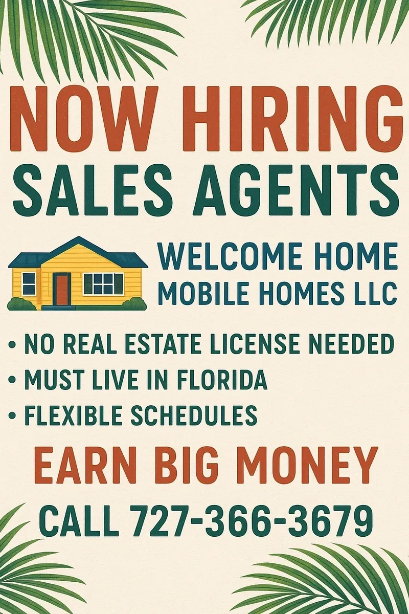 At Welcome Home Mobile Homes LLC, we believe great careers are built on passion, drive, and the right support. We specialize in selling land-leased mobile homes across Florida, and we’re looking for motivated individuals who are ready to turn opportunity into success.